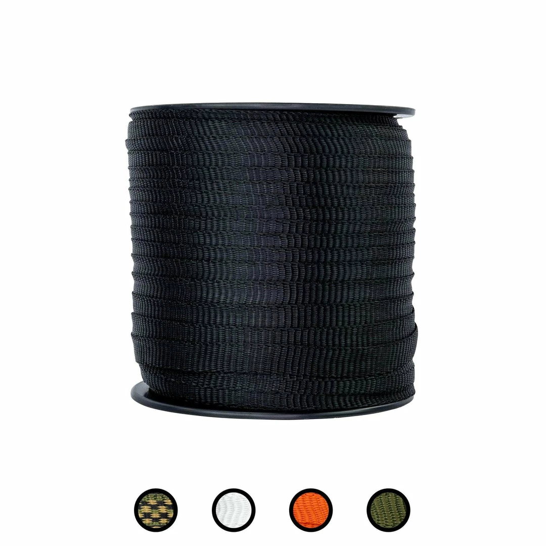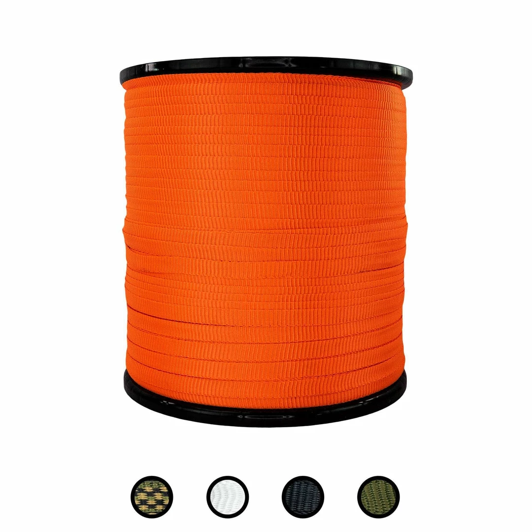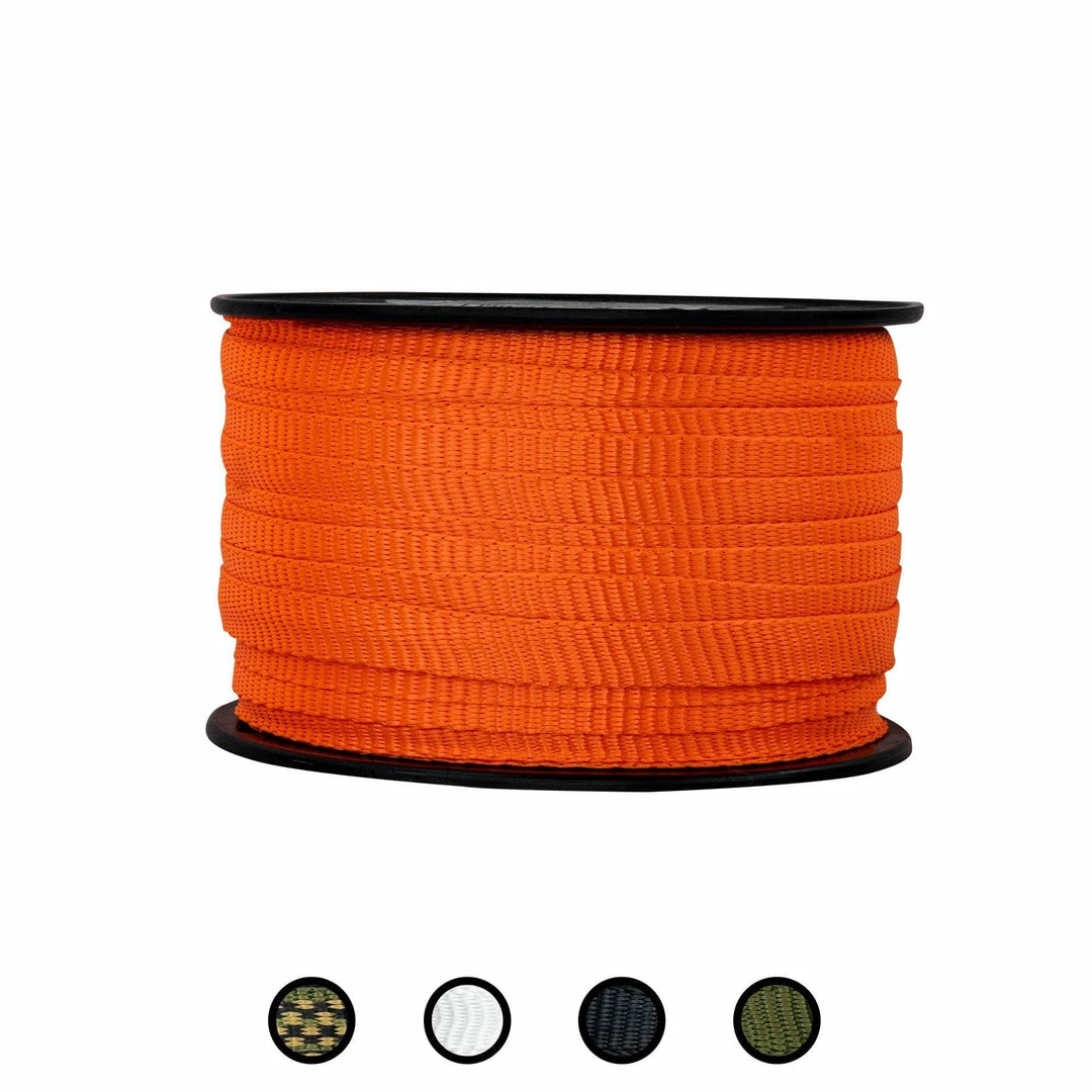 Our polyester webbing flat rope combines the strength of a heavy-duty rope with the even pressure of standard flat webbing. Perfect for indoor and outdoor applications. From cargo straps, to marine rope, to arborists harnesses, use this pull tape for virtually anything.  The tightly woven polyester fibers are naturally resistant to moisture, sunlight, oils, chemicals, and abrasions. Our flat rope is ideal for all weather conditions, rain or shine.